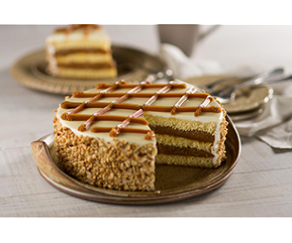 O Bolo Doce de Leite é um pãodeló de baunilha recheado com muito doce de leite, coberto com ganache de chocolate branco, xerém de amendoim e mais doce de leite na decoração.